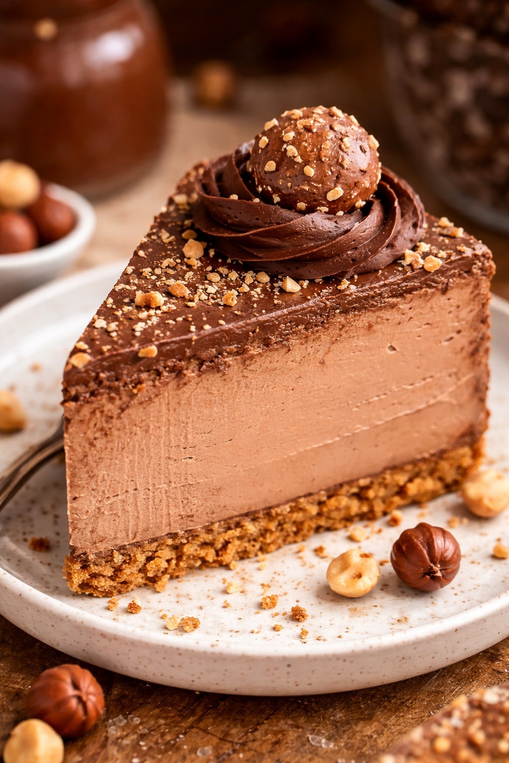 250 g de biscuits au chocolat (environ 2 tasses émiettés) 80 g de noisettes grillées et décortiquées , pour la base (1/2 tasse) 100 g de beurre fondu (7 cuillères à soupe) 300 g de pâte à tartiner aux noisettes (1 tasse) 250 g de fromage frais froid (1 tasse) 200 ml de crème fraîche épaisse (35 % de matières grasses) (3/4 de tasse + 1 cuillère à soupe) 40 g de sucre glace (3 cuillères à soupe), facultatif 8 g de gélatine en poudre neutre (1 sachet, environ 2 cuillères à café et demie) 40 ml d'eau froide pour hydrater la gélatine (2 cuillères à soupe et demie) 60 g de gaufrettes émiettées, facultatif pour le croquant (1 tasse en vrac) 60 g de noisettes grillées hachées pour la garniture (1/2 tasse) 120 g de chocolat noir à 55-70 %, haché ou en pépites (3/4 de tasse) 120 ml de crème pour la ganache (1/2 tasse) 8 à 10 chocolats Ferrero Rocher pour la décoration (8 à 10 pièces) 1 pincée de sel (1/8 cuillère à café) 1 cuillère à café d'extrait de vanille (5 ml)