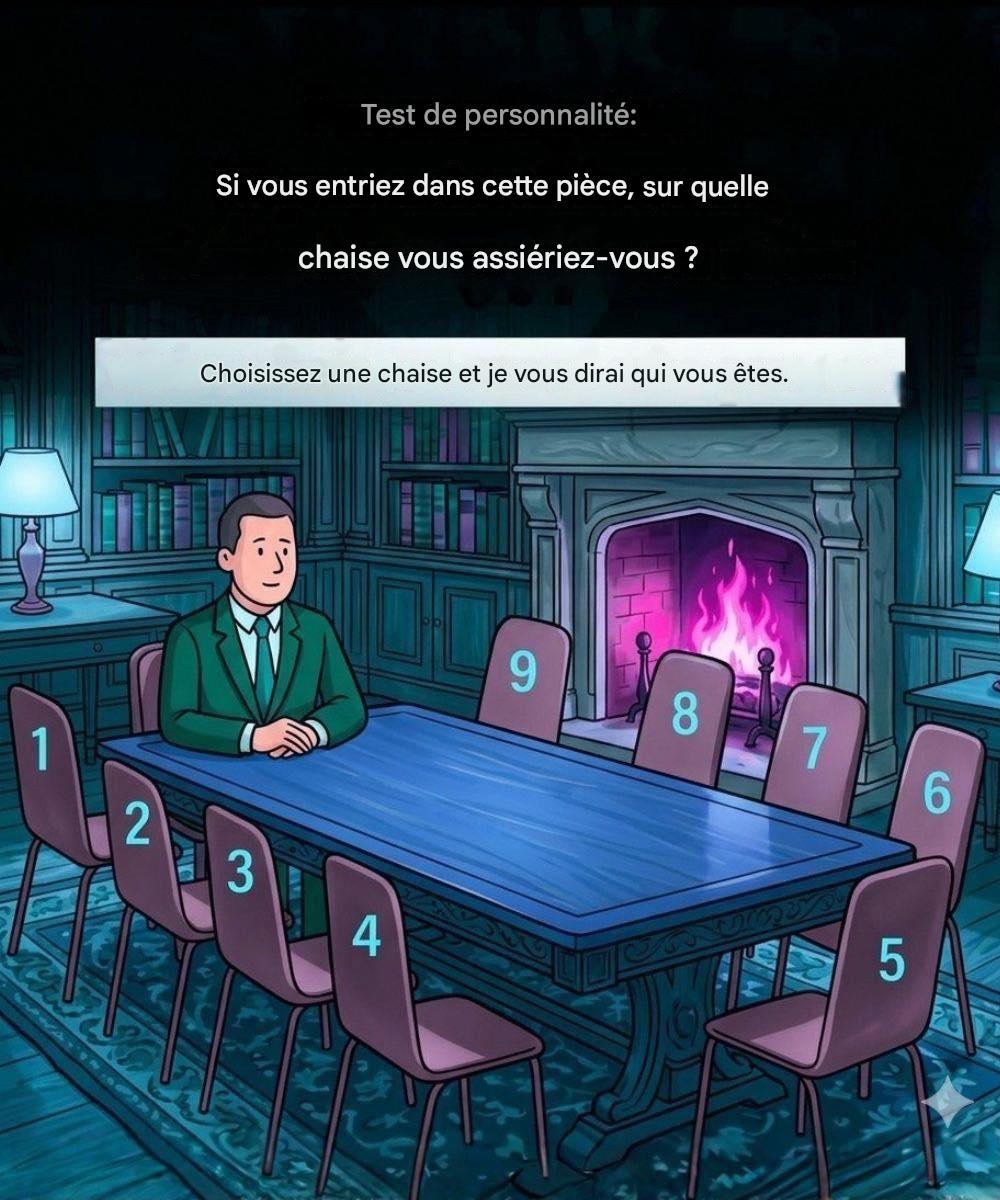 Dans ce test simple, vous entrez dans une pièce avec une longue table, une cheminée chaleureuse et neuf chaises. Une personne est déjà assise. La question est : quelle chaise choisiriez-vous ?