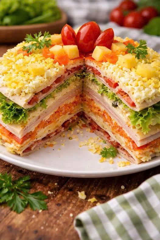 Ce sandwich est une recette froide, pratique et très appréciée pour les fêtes de famille, les anniversaires et les réunions. Il est préparé avec du pain tranché et différentes couches de garniture crémeuse, formant une sorte de tarte salée que l'on découpe en portions.